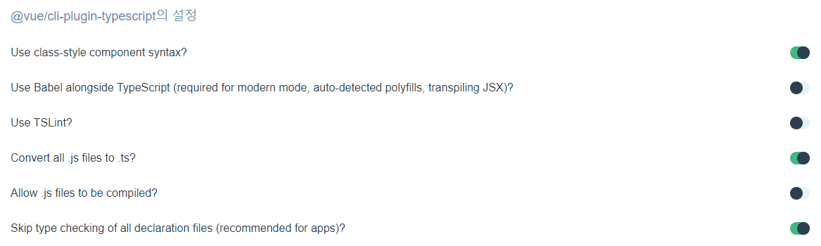 내 경우 vue ui에서 cli-plugin-typescript를 추가하였고 설치를 진행하면 다음처럼 각 설정을 활성화할 것인지를 물어보는 메뉴가 뜨고 기본값을 그대로 두고 설치 완료하였다.