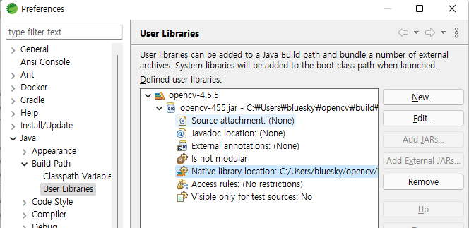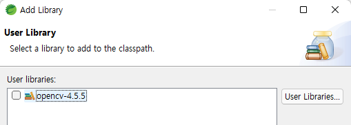 새 User Library에 Add External JARSs... 메뉴로 설치한 OpenCV 폴더의 build/java/opencv-455.jar를 추가한다.