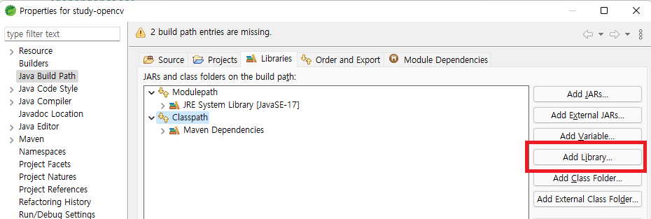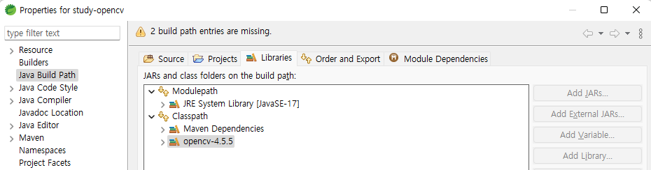 추가된 jar의 Native library location에 build/java/x64/opencv_java455.dll을 추가해준다.