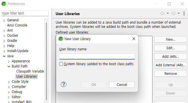 Eclipse (또는 STS)에서 Window -> Preferences의 Java -> User Libraries에 새 User Library를 추가한다.