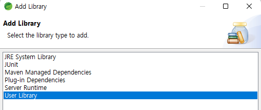 Package Explorer에서 대상 프로젝트에서 오른쪽 마우스 -> Properties를 선택하여 나온 설정창에서 Java Build Path -> Library를 선택하여 Classpath에서 Add Library를 선택, User Library에서 추가한 라이브러리를 선택해준다.