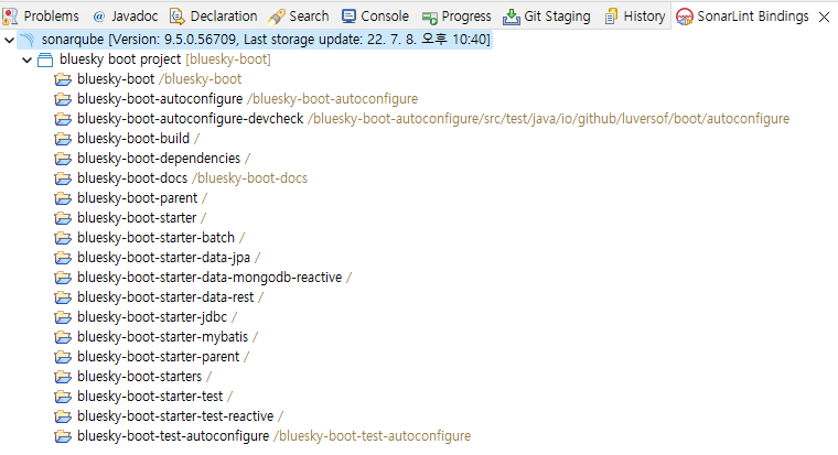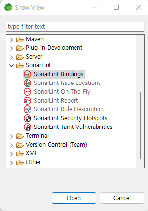 선택을 하고 나면 연결된 항목을 Window -> Show View -> Other에서 SonarLint Bindings를 선택하여 확인할 수 있다.