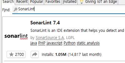 Help -> Eclipse Marketplace에서 SonarLint를 검색하고 설치한다.