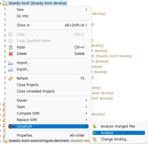 Package Explorer의 대상 프로젝트에서 오른쪽 마우스 -> SonarLint -> Analyze를 실행한다.