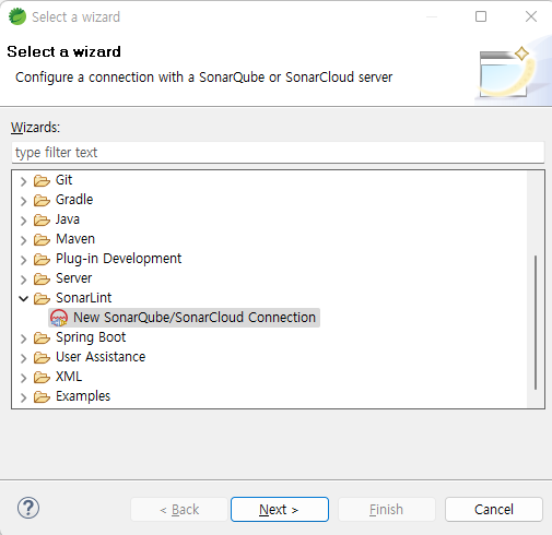 STS의 File -> New -> Other를 선택해서 나오는 창에서 SonarLint의 New SonarQube/SonarCloud Connection을 선택한다.