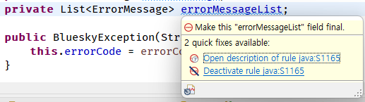 각 항목을 클릭해서 해당 문제 위치를 가보면 SonarLint가 경고를 파란색 밑줄로 알려주며 마우스를 올리면 해당 내용을 확인할 수 있다.