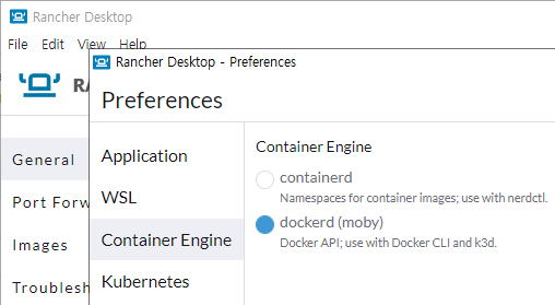 다음과 같이 Preferences에서 containerd 대신 dockerd를 선택하고 재시작하면 된다.