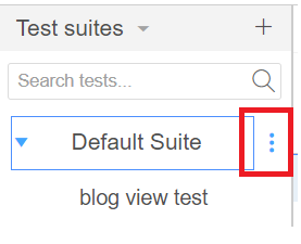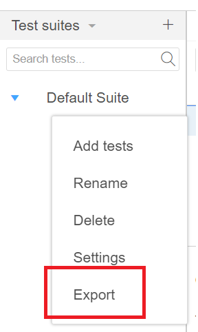 export메뉴는 다음과 같이 tests 메뉴의 테스트 또는 test suites의 suite의 오른쪽에 있는 점 세 개의 메뉴 항목을 선택하여 확인할 수 있다.