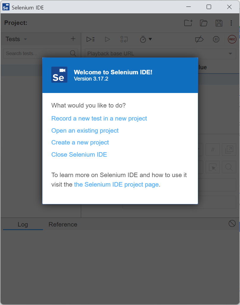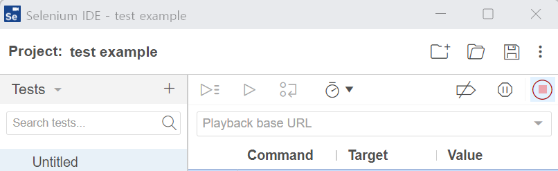 설치 후 Selenium IDE 확장 프로그램을 실행하면 다음과 같이 Selenium IDE가 열린다.