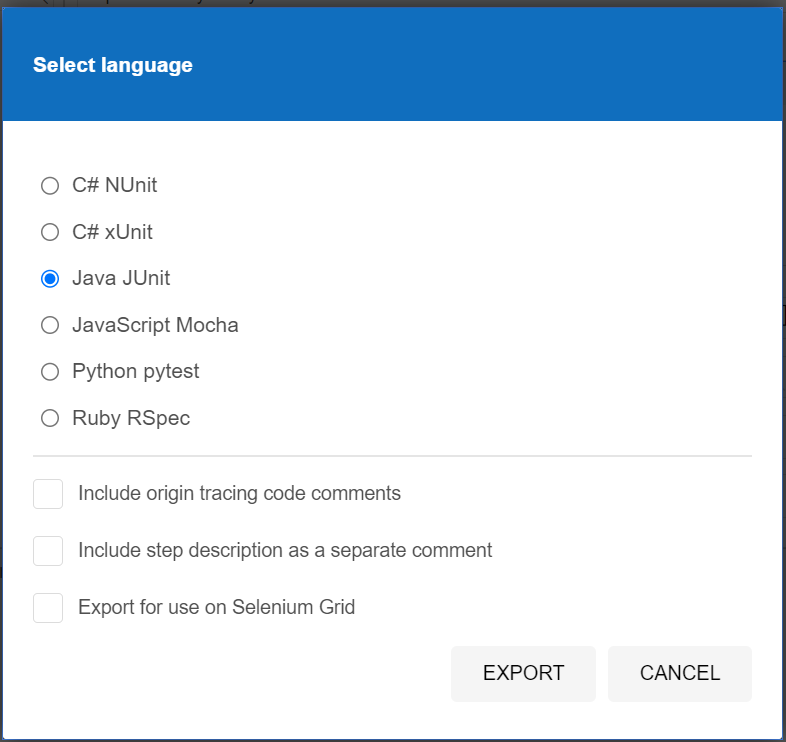 또한 이렇게 녹화된 액션을 저장하거나 여러 언어의 test code로 export 할 수 있다.