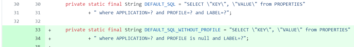 spring.cloud.config.server.jdbc.sql-without-profile=SELECT "KEY", "VALUE" from PROPERTIES where APPLICATION=? and PROFILE is null and LABEL=?