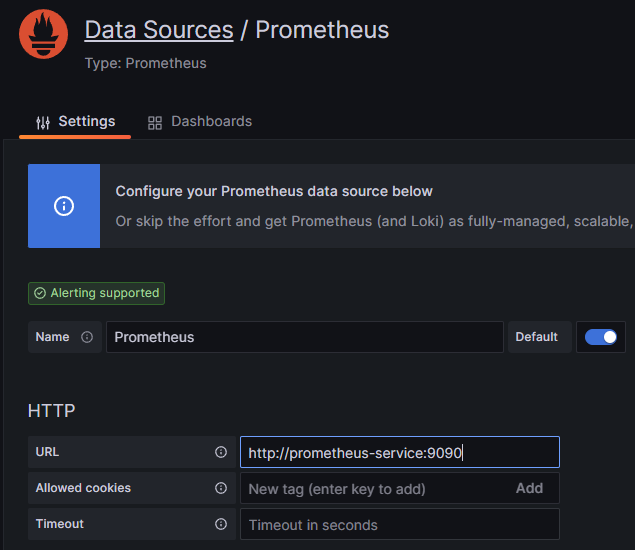 내 경우 위 kubernetes yaml설정대로 진행하였다면 호출 주소는 http://prometheus-service:9090이다.