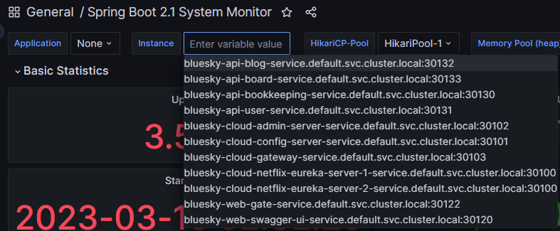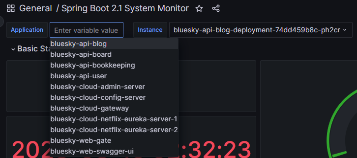 grafana dashboard에서 application과 instance로 구분된 조회 기준을 제공하는데 현재 설정으로는 application은 존재하지 않고 instance로 대상을 선택할 수 있는 상태이다.