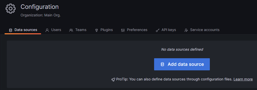 우측 하단 Configuration의 Data sources 탭에서 Add new data source로 prometheus를 추가한다.