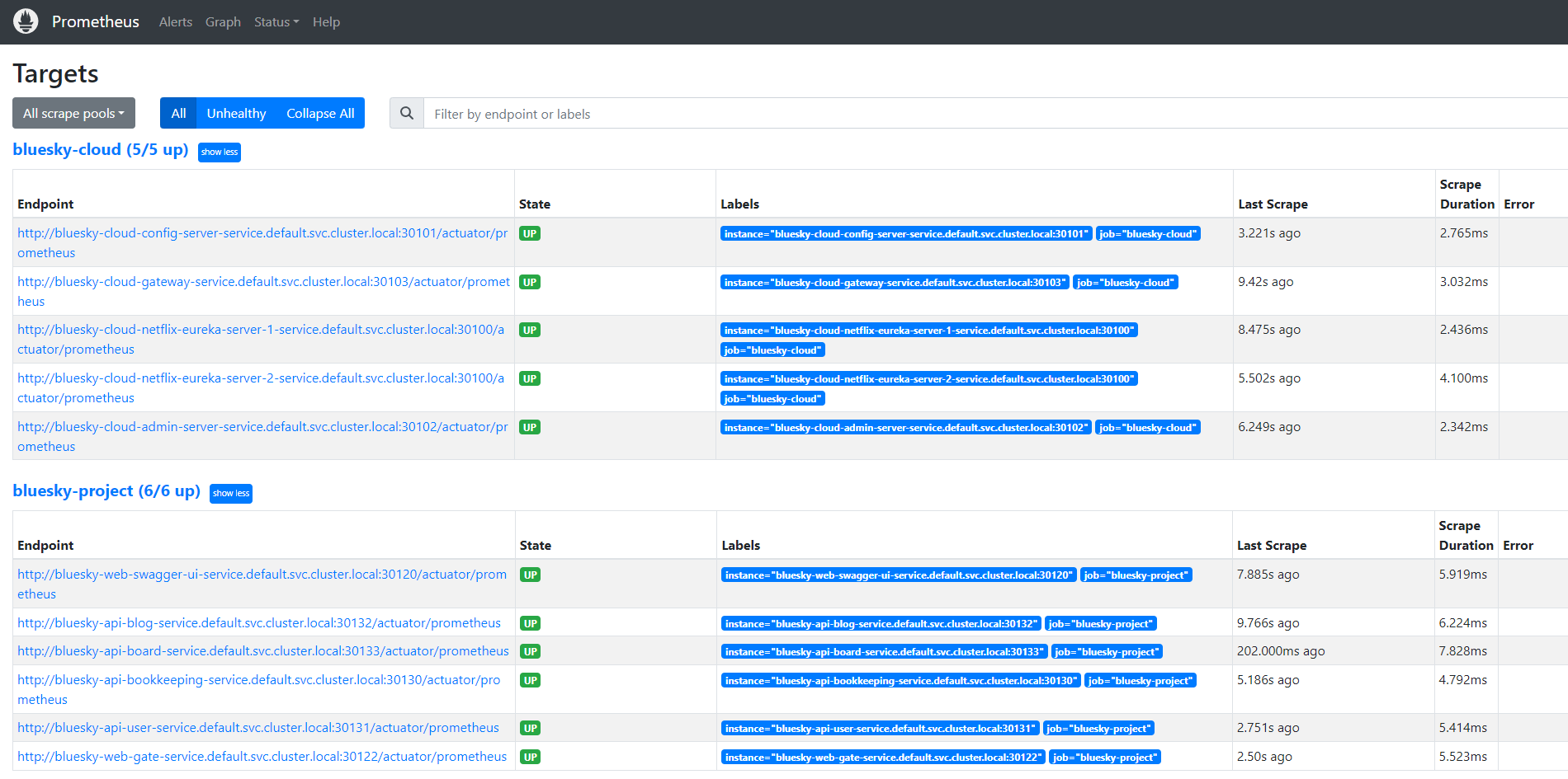 위에 prometheus.yml에 설정한 job의 주소는 kubernetes service 기준 호출 주소이다.