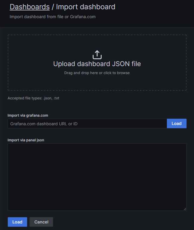 grafana는 dashboard를 사용자가 일일이 만들지 않고 이미 만들어진 dashboard를 사용할 수 있도록 import export를 제공한다.
