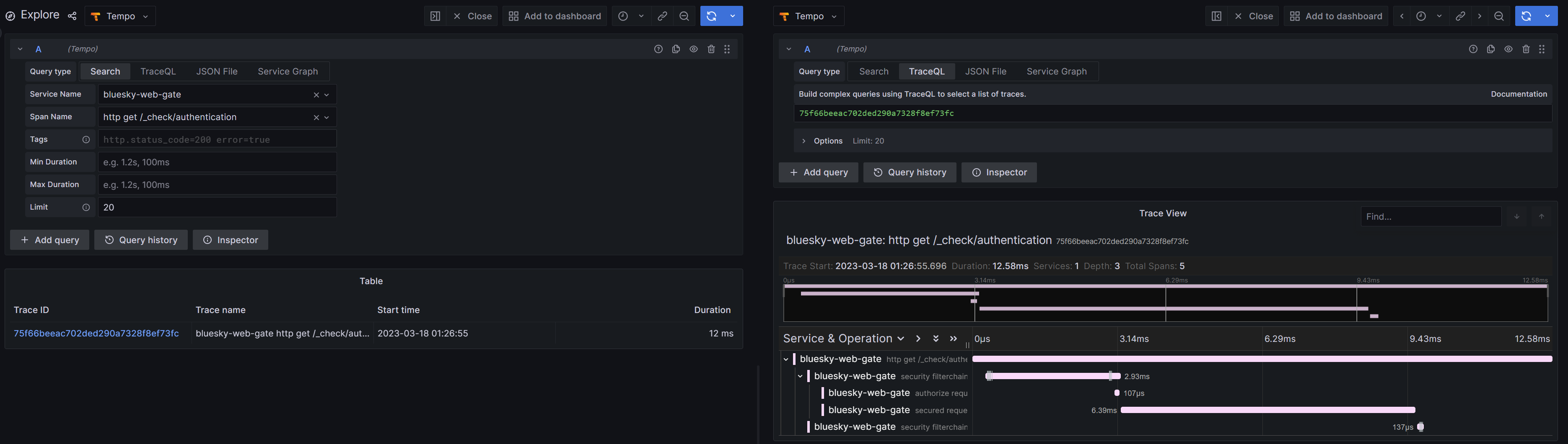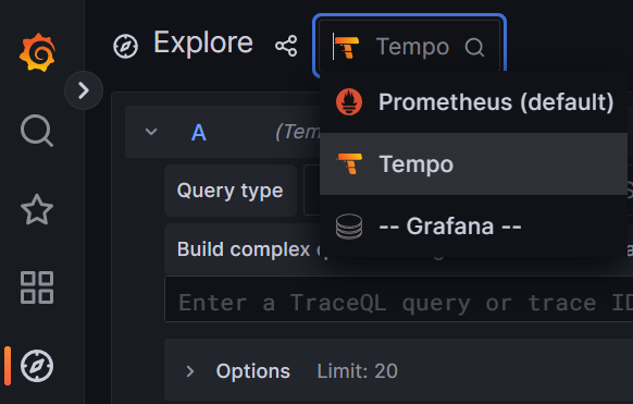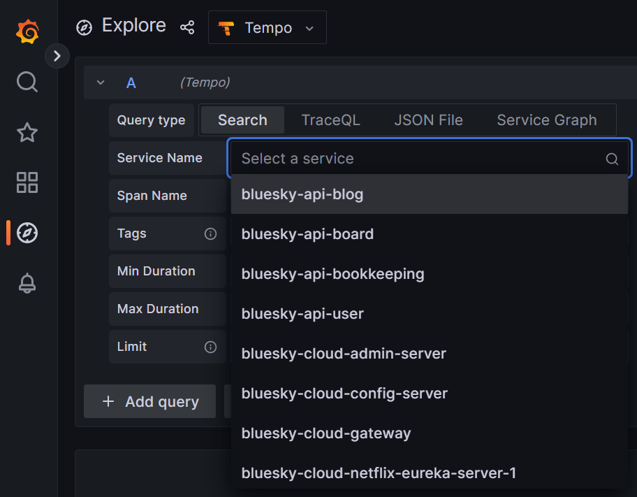 grafana의 explore로 이동하여 Tempo를 선택한 후