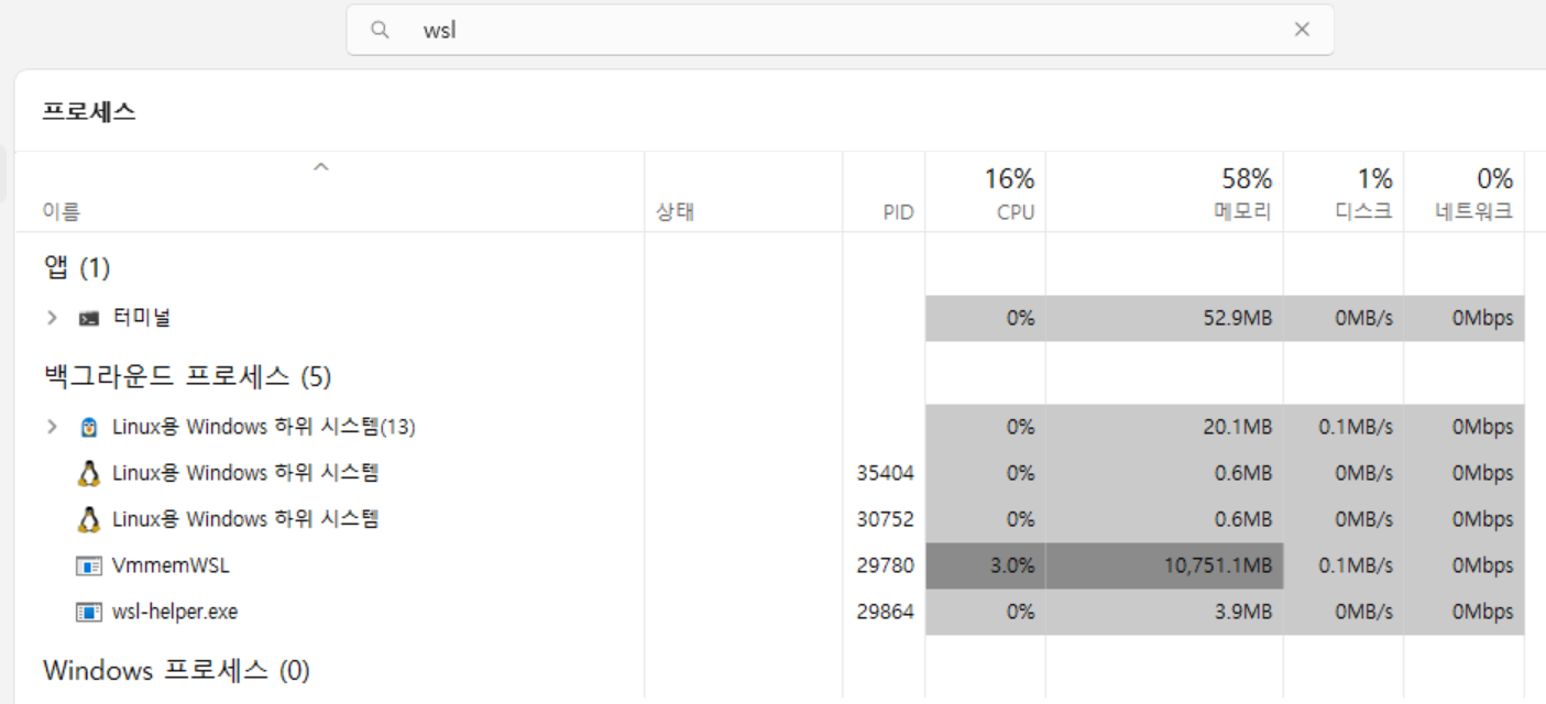 - 작업관리자에서 VmmemWSL의 디스크 사용량이 지속적으로 발생하고 있었다.