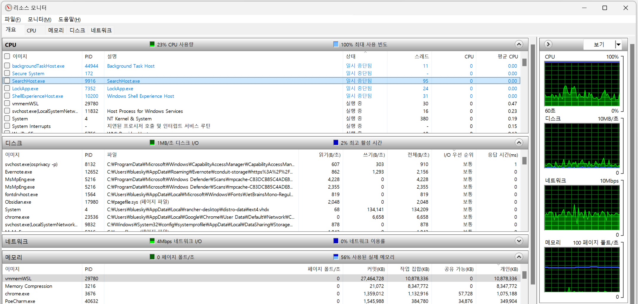 또한 좀 더 자세한 내용은 Window 리소스 모니터를 통해 확인할 수 있다.