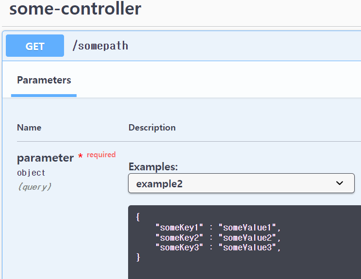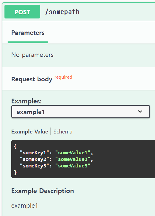 example을 미리 작성하여 제공하면 기본 값이 아닌 설정한 example의 값이 제공되고 요청에 필요한 필드들만 설정할 수 있어 해당 요청에 필요한 값이 어떤 것인지 어떤 값을 설정해야 하는지 파악하기 쉽다.