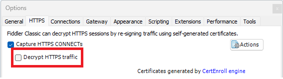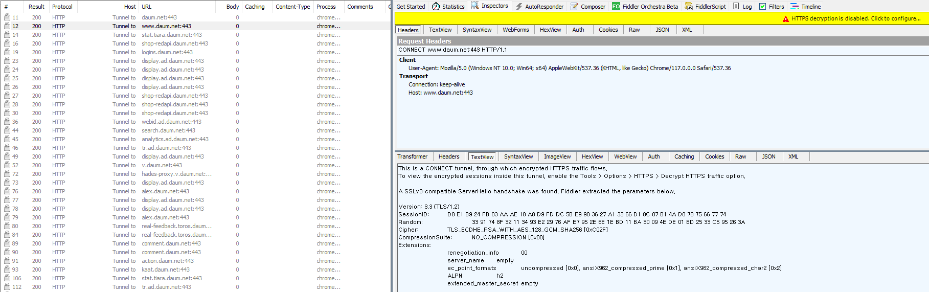 상단 메뉴의 Tools -> Options -> Https 탭을 선택하고 Decrypt Https traffic을 활성화한다.