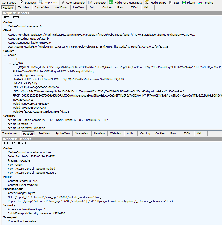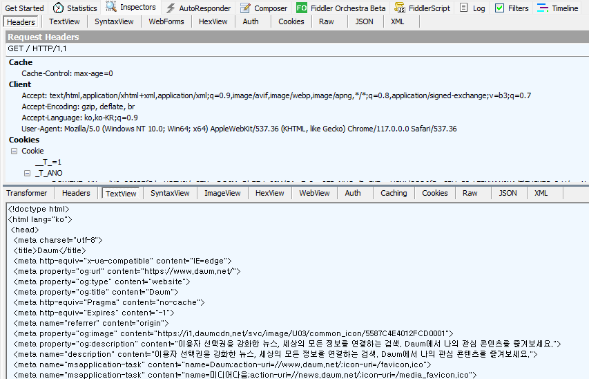Inspectors 탭의 위쪽은 Request에 대한 내용이고 아래쪽은 Resposne에 대한 내용이다.