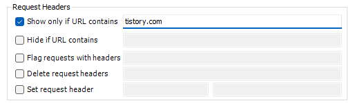 예를 들어 tistory.com 도메인만 캡처하고 싶은 경우 Request Headers를 다음과 같이 설정하면 된다.