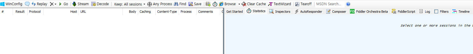 fiddler를 설치하고 실행하면 기본적으로 웹 트래픽을 캡처하는 상태가 된다.