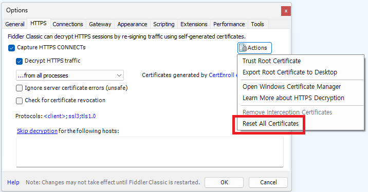 내 경우 잘 사용하다가 어느 순간 Https traffic Capture가 제대로 되지 않았다.