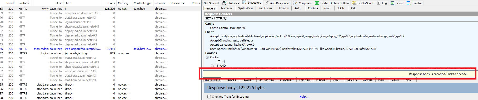 해당 요청을 선택하고 Inspectors 탭을 선택하면 Response Body를 decode 할지 여부를 묻는 탭이 화면에 보인다.