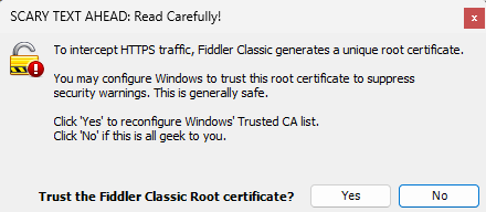 활성화 시 Https traffic을 intercept 하기 위한 인증서 생성을 신뢰할 것인지 물어본다.
