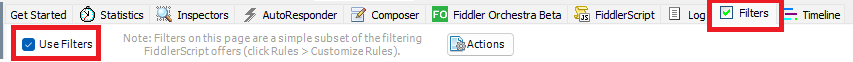 Fiddler 화면 오른쪽 항목에서 Filter 탭을 선택 -> Use Filters를 체크하여 활성화한 후 내가 원하는 조건을 설정하면 된다.