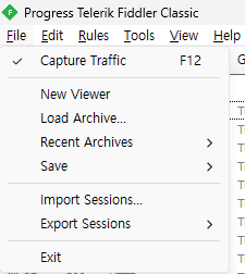 만약 캡처를 중단하고 싶으면 F12를 누르거나 File -> Capture Traffic을 선택하여 비활성화하면 된다.