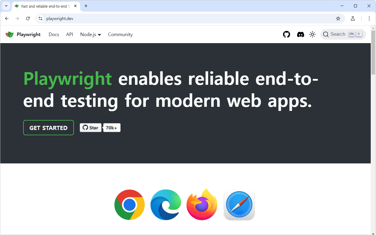 Playwright 는 Microsoft에서 만든 end-to-end 테스트를 위해 사용되는 라이브러리인데 Chromium , WebKit , Firefox 를 포함한 모든 최신 rendering engine을 지원하고 Windows , Linux 및 MacOS 에서 로컬 또는 CI에서 headless 또는 native mobile emulation을 사용한 headed 테스트를 지원한다.