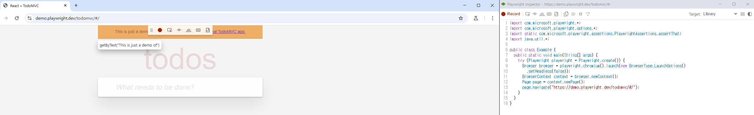 page.getByRole(AriaRole.TEXTBOX, new Page.GetByRoleOptions().setName("What needs to be done?")).fill("테스트로 TO 입력");