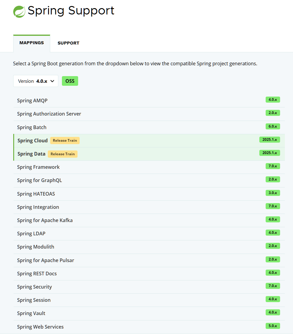 Spring 홈페이지의 상단 메뉴에서 `Project` -> `Overview` 를 선택하면 상단에 `VERSION MAPPINGS` 메뉴가 보인다.