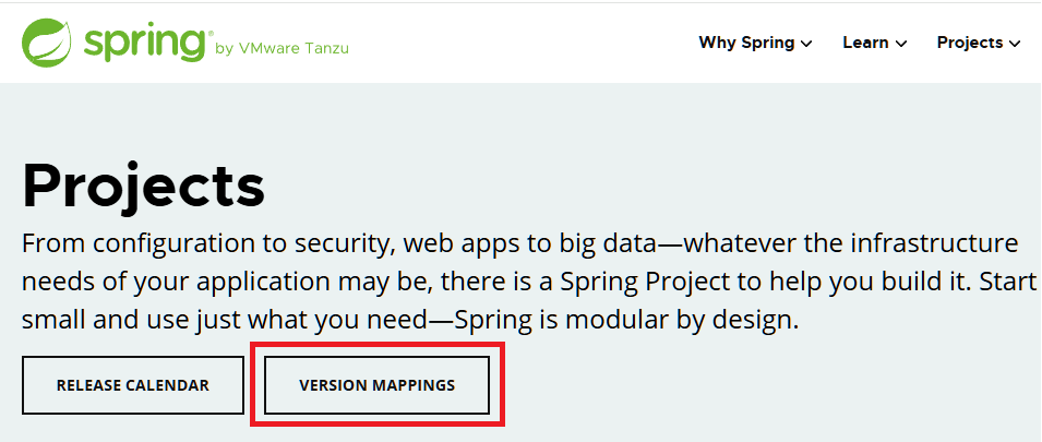 Spring 홈페이지의 상단 메뉴에서 `Project` -> `Overview` 를 선택하면 상단에 `VERSION MAPPINGS` 메뉴가 보인다.