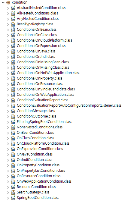 이러한 조건들은 다양하며 spring-boot-autoconfigure의 org.springframework.boot.autoconfigure.condition 패키지 내에 제공된다.