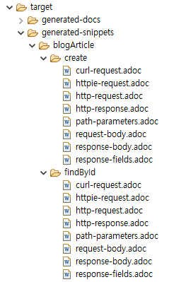 - test 코드가 수행되며 spring rest docs가 test 요청/응답에 대한 snippet을 /target/generated-snippets에 생성