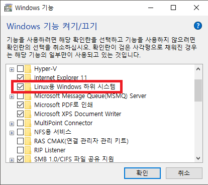 우선 windows 기능 켜기/끄기 메뉴에서 'Linux용 Windows 하위 시스템' 기능을 켠다.