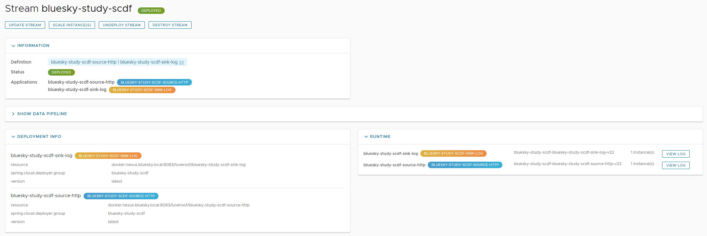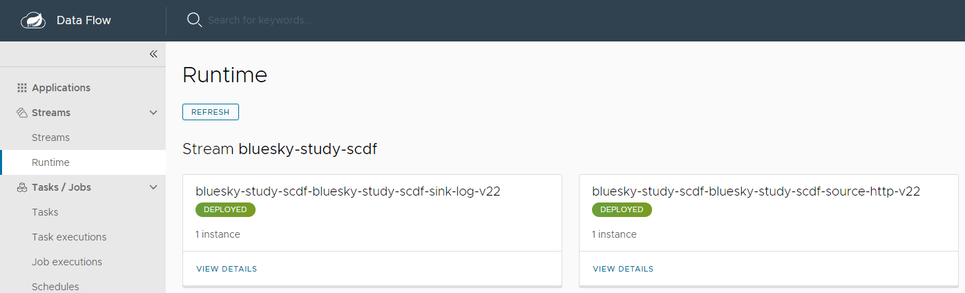 또한 Stream의 Runtime 항목에서 현재 배포된 Stream이 무엇이 있는지 확인할 수 있다.