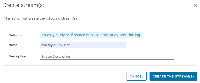 우측 화면에서 사용하고자 하는 Source , Processor , Sink 를 배치한 후 각 단계 사이를 연결해 주고 하단의 Create Stream 을 선택하면 생성할 Stream의 이름을 지정하는 레이어가 뜬다.
