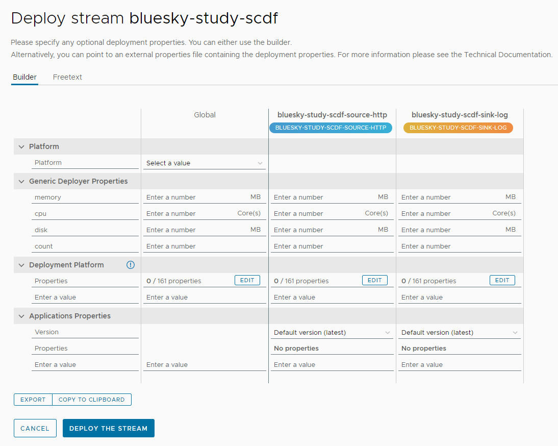 상단의 Deploy Stream 버튼을 누르면 배포할 환경과 배포 시 설정할 값들을 추가할 수 있는 항목이 뜬다.